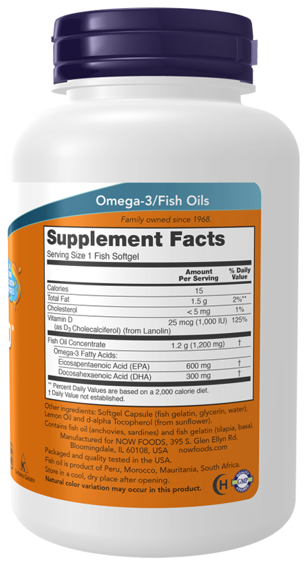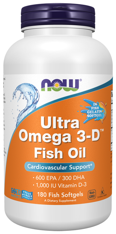 Ultra Omega 3-D от NOW - это наше самое мощное средство с омега-3, содержащее 600 мг ЭПК и 300 мг ДГК в каждой капсуле. Продукт содержит лимонное масло, а также 1000 МЕ витамина D3. Этот концентрат рыбьего жира производится в соответствии со строгими стандартами контроля качества. Он протестирован на отсутствие потенциально опасных загрязняющих веществ (например, ПХД, ртути, диоксинов и других загрязняющих веществ). В этом продукте используется капсула из рыбьего желатина, которая является альтернативой капсуле из говяжьего и свиного желатина.